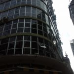 Projetado inicialmente em “estilo Manhattan”[3], com volume prismático, envolto por três tipos diferentes de vidro e coberto por brise-soleils, o edifício encontra-se hoje bastante descaracterizado. As modificações começaram já na fase de projeto, quando a prefeitura determinou o recuo lateral dos andares superiores. Segundo a pesquisadora Daniela Viana Leal, “o edifício Triângulo era um bloco prismático [em que os andares superiores repetem a estrutura dos inferiores], como o Copan. Mas a legislação exigia que, quanto mais alto o prédio, maior fosse o recuo lateral nos andares superiores — aquela impressão de ‘bolo de noiva’. Isso não fazia sentido no projeto de Niemeyer, mas foi alterado.”[4] Posteriormente, os brise-soleils foram retirados,[5][6] expondo o edifício à incidência direta do sol. A entrada principal é recoberta por um grande um painel de pastilhas de Di Cavalcanti, hoje bastante deteriorado.[7] Nos anos 1990, moradores de rua faziam fogueiras junto ao painel, para se aquecer, e parte das pastilhas de vidro caiu, sendo substituída por outras de cerâmica, que também caíram. O mural do edifício foi tombado em 2004, pela prefeitura de São Paulo.[8] https://pt.wikipedia.org/wiki/Edif%C3%ADcio_Tri%C3%A2ngulo